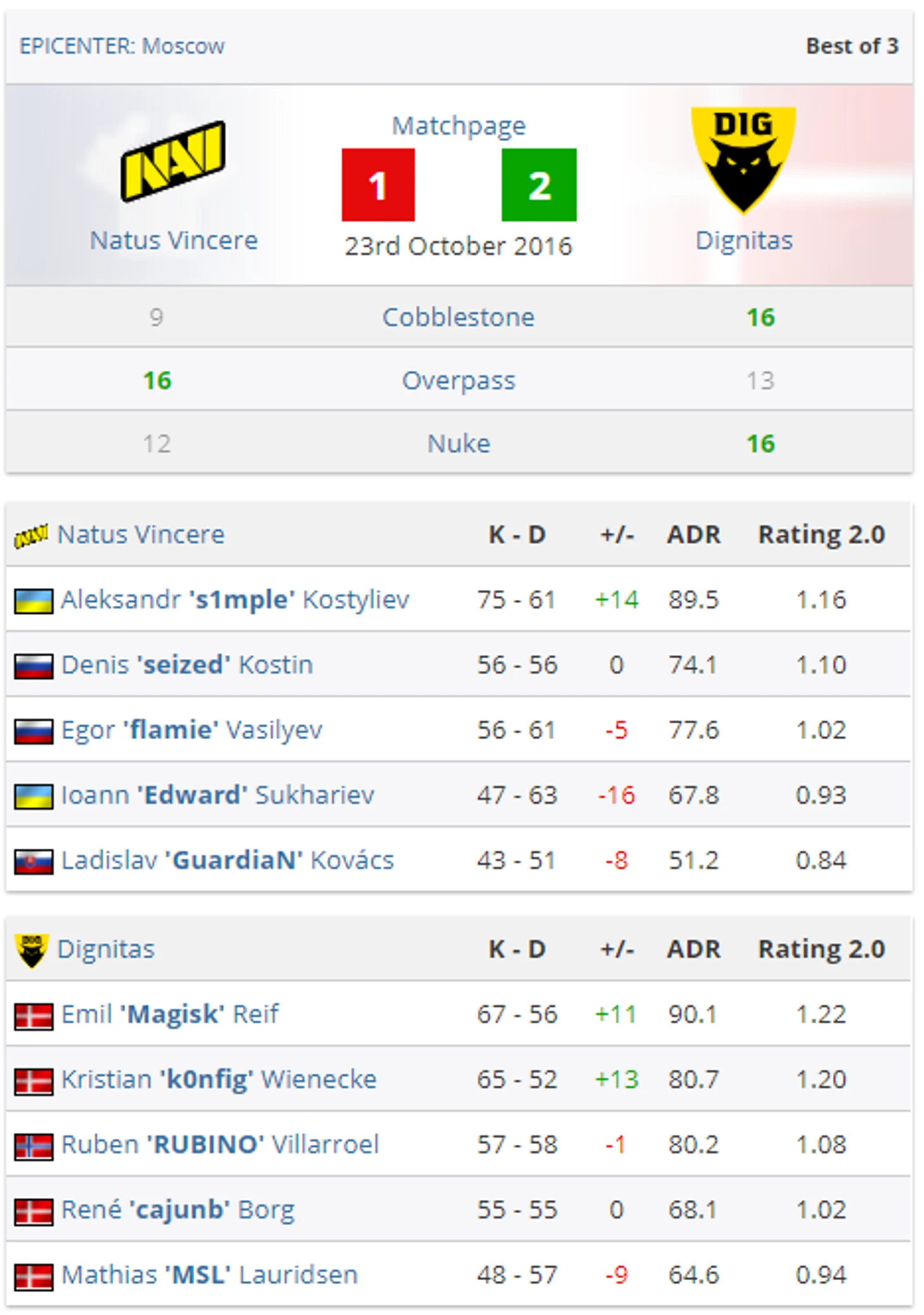 NAVI - Dignitas. Ох, как мы удивились, когда датчане без особых усилий забрали Кобблстоун. Но дальше был Оверпасс — пик СНГ-коллектива. Но первая половина закончилась со счетом 12-3 в пользу Dignitas! И лишь героический камбек, клатч Сизда и феноменальный Симпл спасли желто-черных от поражения на второй карте. На Нюк NAVI должны были перенести ту энергию, потому что матч был правда эмоциональным, но не сложилось, и 75 фрагов Александра Костылева не помогли. Тогда мы еще не могли подумать, что пройти эту стадию этот состав уже никогда не сможет (не считая Adrenaline Cyber League 2017, но там было 4 команды).