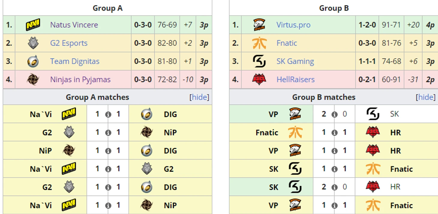 Формат турнира был довольно необычным. Команды разбили на две группы по 4 участника. Каждая играет друг с другом две карты. Победа 2-0 — три очка, ничья 1-1 — одно, поражение 0-2 — ноль. Ну а дальше все по классике. Первое место выходит напрямую в полуфинал, где ожидает пока 2-3 места разыграют четвертьфиналы.