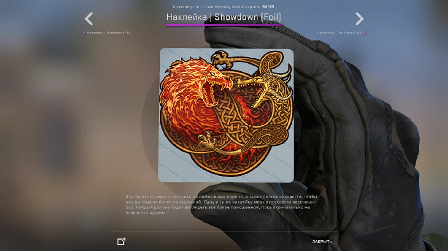В капсуле очень много отсылок к люксовым скинам. Самая зрелищная подобная наклейка – Showdown. Здесь смешались два образа – «Драгон Лор» и «Вой». С Авика и Эмки, соответственно.