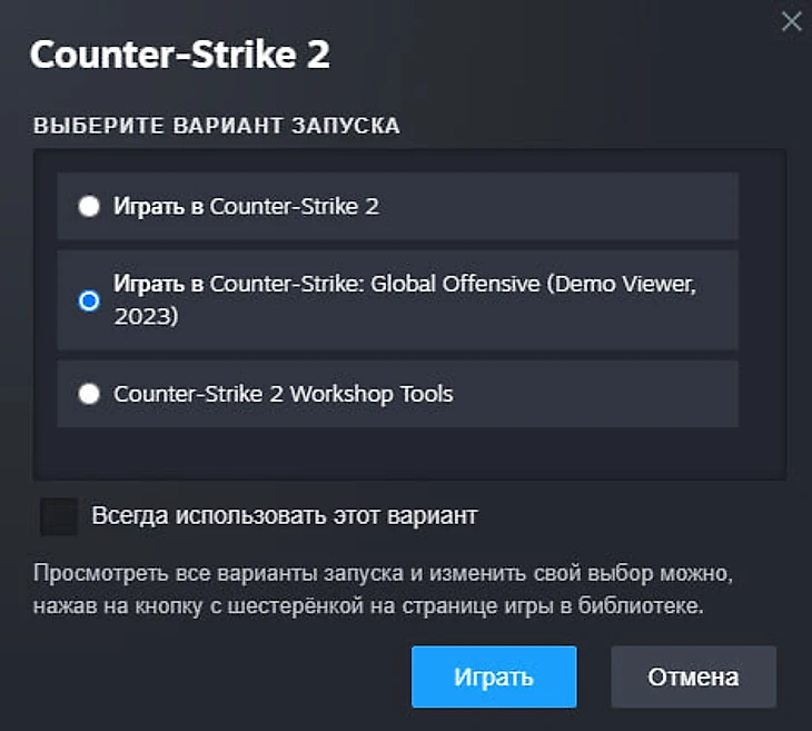 После скачивания запустите игру. Откроется окно с параметрами запуска – выберите Counter-Strike Global Offensive