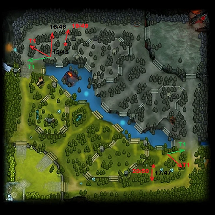 Вам нужно знать тайминги стаков и отводов. Вот карта с отмеченными направлениями пуллов и ключевыми секундами. До слабого лагеря вы добегаете примерно за 15 секунд, а до глубоких лесных лагерей – за 25. Это поможет не опаздывать на стаки и отводы.