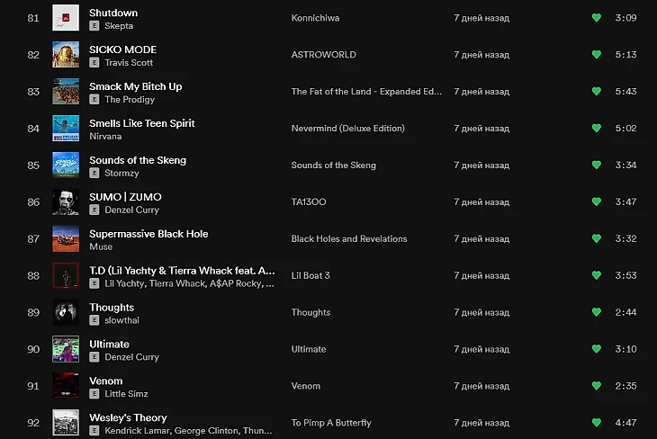 Советую отсортировать плейлисты по названию песен – так они будут максимально перемешанными и сбалансированными по настроению. Основа плейлиста – динамичный американский и британский рэп (Kendrik Lamar, Skepta, 21 Savage).