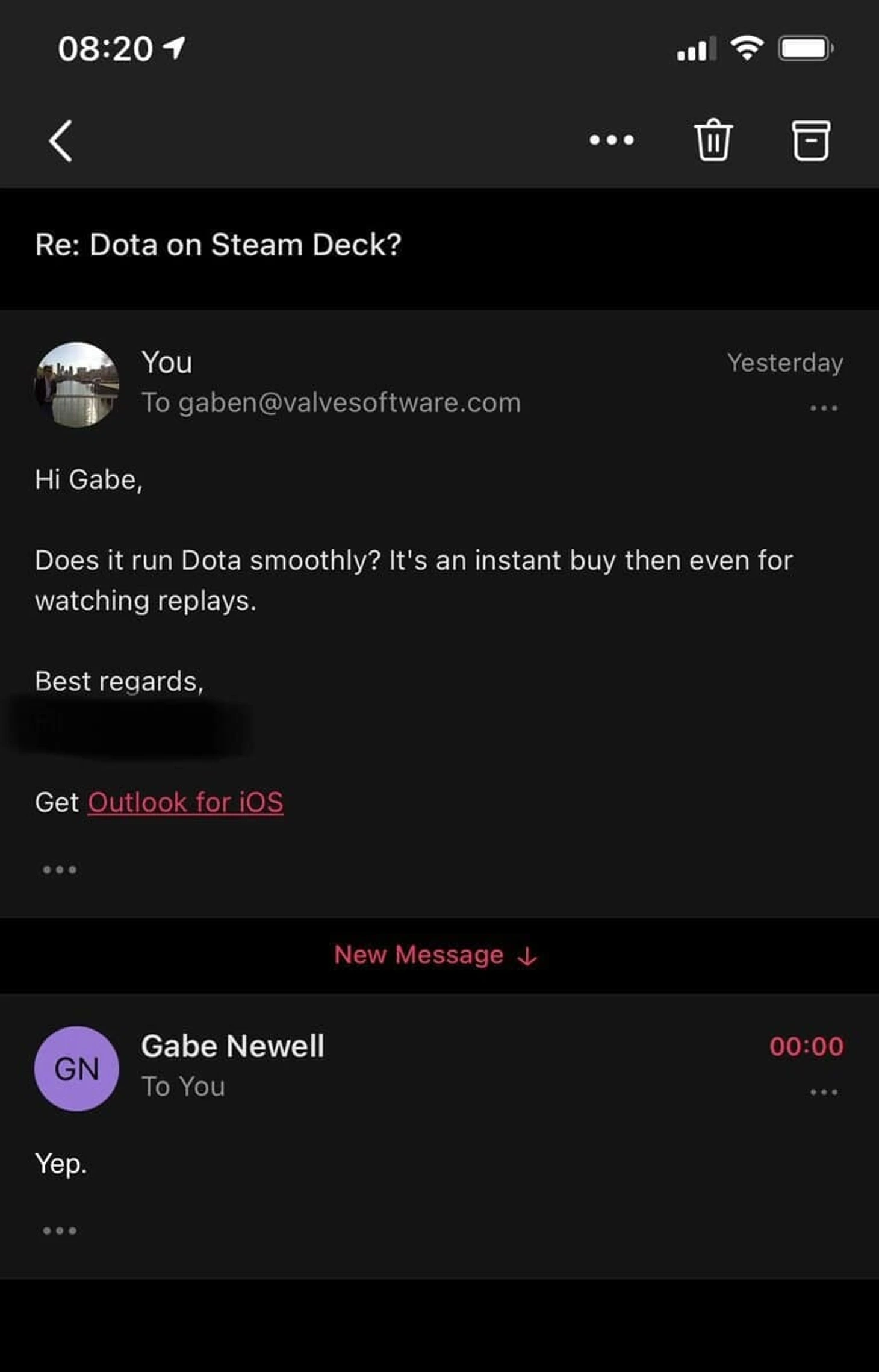 На Реддите появился пост со скриншотом, на котором пользователь написал Гейбу Ньюэллу и спросил, будет ли Дота нормально работать на новой портативной консоли от Valve Steam Deck.