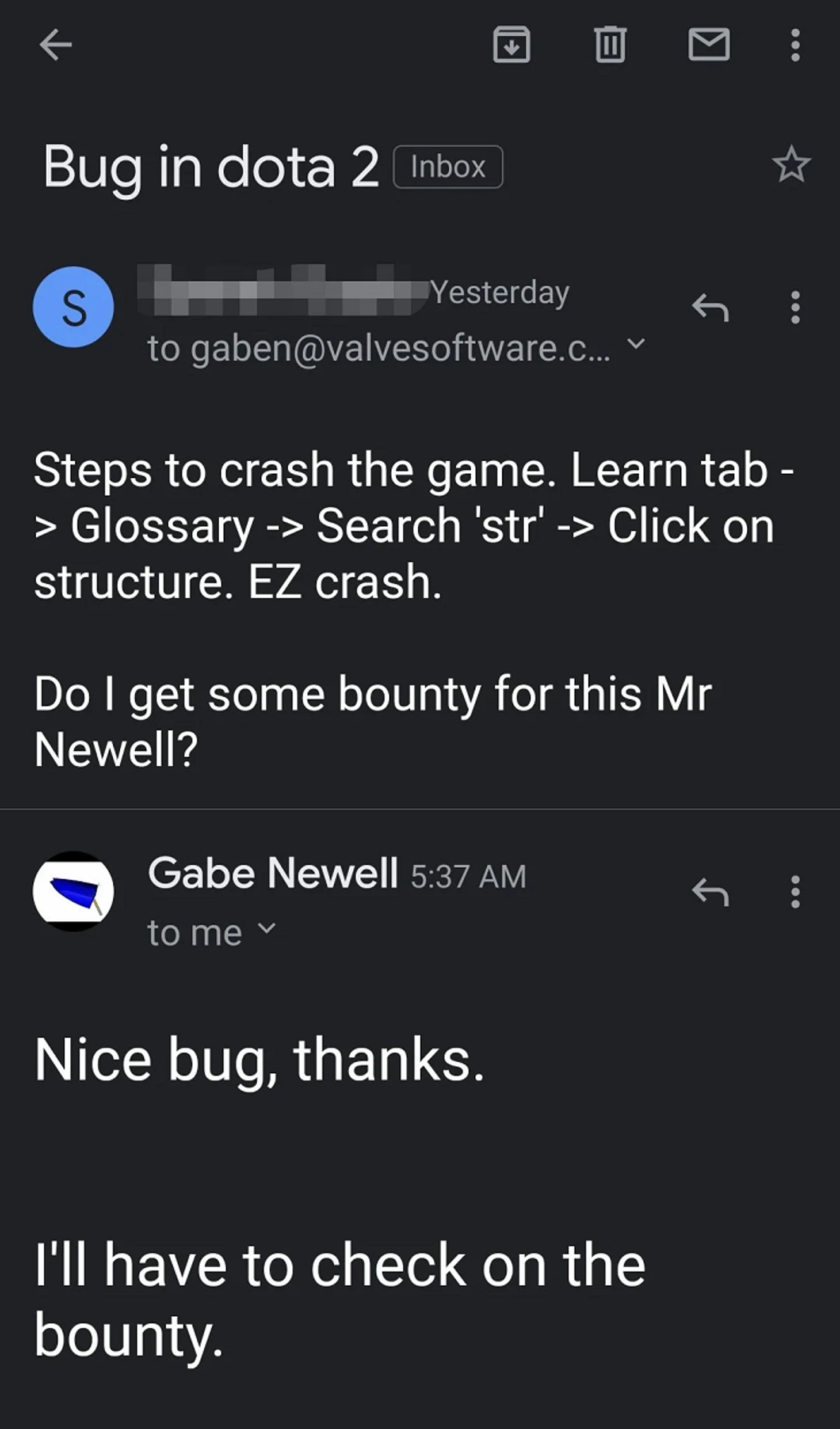 К слову, Гейб держит близкую связь с комьюнити и часто отвечает на фанатские письма. Таким образом мы узнали, что перенести Инт в Новую Зеландию невозможно, ведь спортсмены будут возвращаться с Олимпийских игр, и не получится организовать карантин дотерам. А на этой неделе он поблагодарил геймера за найденный баг, позволяющий крашнуть Доту.