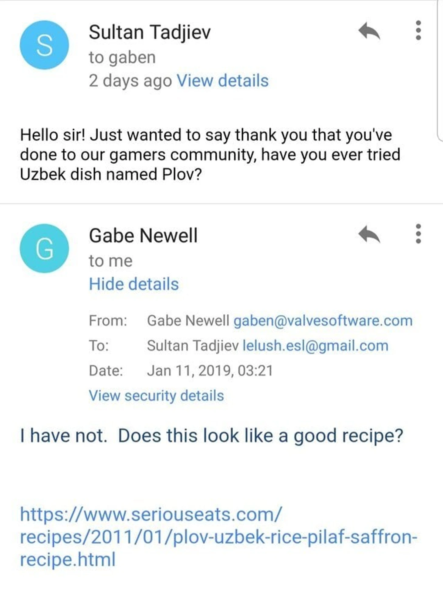 «Здравствуйте! Хотел поблагодарить за то, что вы сделали для игрового сообщества и спросить: вы когда-нибудь пробовали плов?»