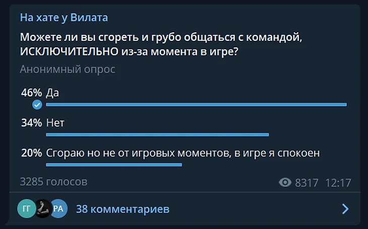 Он также опубликовал опрос «Можете ли вы сгореть и грубо общаться с командой ИСКЛЮЧИТЕЛЬНО из-за момента в игре?». На момент написания текста проголосовало 3285 человек. Как оказалось, большинство респондентов (включая меня) может.