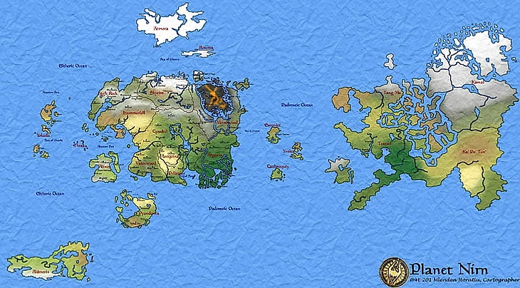 Нирн – мир в форме шара, который имеет два естественных спутника, Массер и Секунду. Известны три крупных материка, окруженных мировым океаном – Акавир в восточном полушарии, Тамриэль – в западном и Атмора на севере. Также к западу от Тамриэля расположен разрушенный катаклизмом архипелаг Йокуда, а к югу – Пиандонея. Далекий и почти мифический Альтмерис лежит далеко на юго западе. Все эти земли населены просто диким количеством разумных рас.