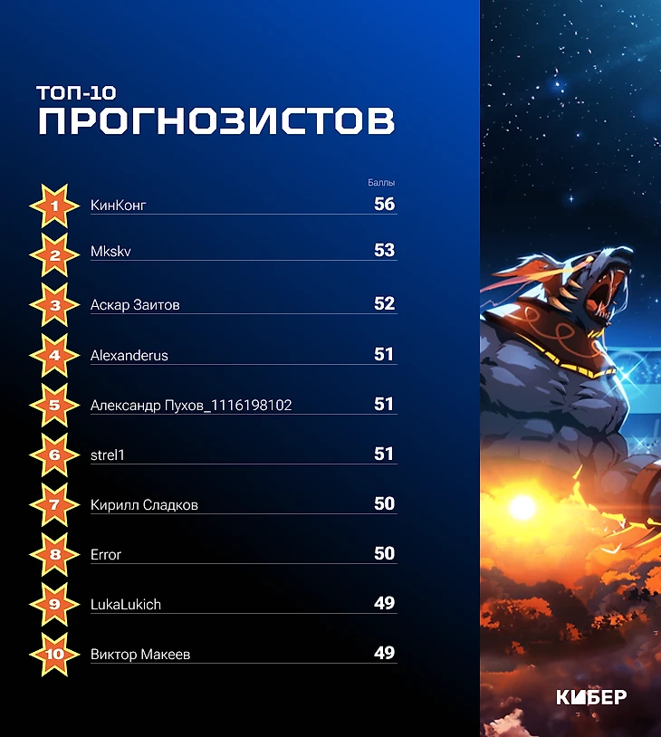 В конце каждого игрового дня мы будем публиковать пост с расписанием матчей на следующий день. Ваша задача – угадать результаты матчей. Собирать предикты мы будем в комментариях под ежедневными постами. В них же будем публиковать топ-10 прогнозистов.
