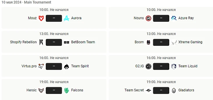 Турнир откроют противостояния Aurora против MOUZ и Azure Ray против nouns. Также сегодня нас ждет дерби - Team Spirit против Virtus.pro.