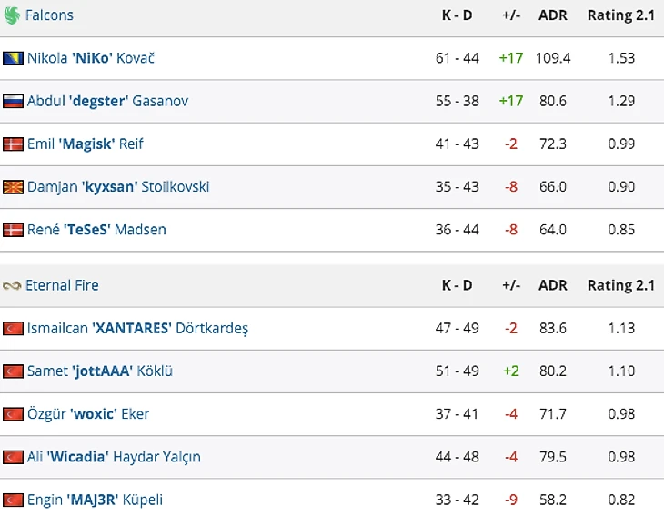 Этот четвертьфинал, пожалуй, можно было считать самым “равным”. Хоть турки и успели показать отличные результаты в начале этого года (2-е место на BLAST Bounty и выход в плей-офф в Катовице), в Румынии Falcons доказали, что их ещё рано списывать со счетов.