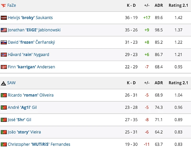 FaZe победили SAW со счётом 2:0 (13:4 Ancient, 13:9 Nuke).