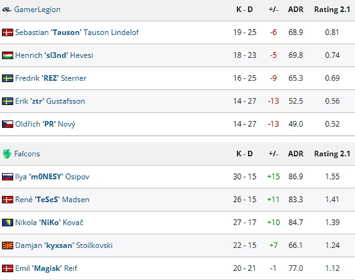 Falcons, в свою очередь, быстро становятся командой, с огневой мощью которой нужно считаться. Причём в этот раз засиял ещё и TeSeS. Видимо, в составе Falcons яркий дуэт m0NESY - NiKo постепенно превращается в трио.