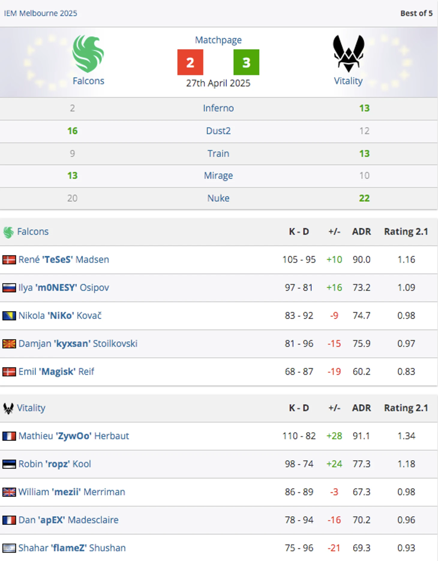 В какой-то момент на dust2 у “соколов” что-то кликнуло, и они забрали 7 раундов из 8. Дело дошло до овертайма, в котором Falcons выиграли все 4 раунда. И вот она - первая карта, проигранная Vitality в Мельбурне.