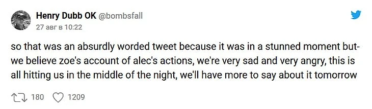 «Это был абсурдно сформулированный твит, потому что произошедшее застало меня врасплох, но я верю показаниям Зои о действиях Алека, мы очень разозлены и расстроены, это все застало нас посреди ночи. Мы вернемся к этой теме завтра»