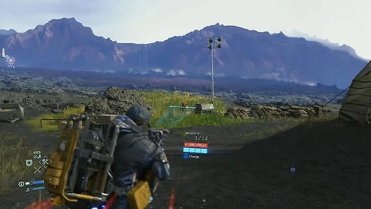 • Местами Death Stranding сильно напоминает Metal Gear Solid: игрок обнаружил лагерь врага (те самые парни в желтом, похожие на курьеров Яндекс.Еды) и начал его скрытую зачистку. Для этого Сэм использует удавку и оружие, которое стреляет во врагов сеткой-электрошоком. Также присутствуют элементы рукопашного боя.