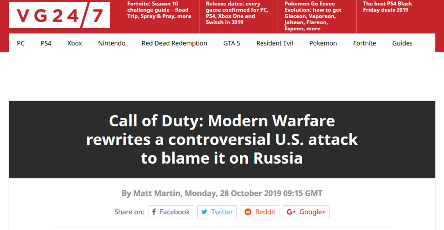 Скандал вокруг провокационного сюжета Call of Duty: Modern Warfare (2019) дошел до федеральных телеканалов. Еще после анонса игры в мае «Россия-24», РЕН ТВ, «Царьград» и Russia Today раскритиковали трейлер игры за показ членов «Белых касок» в качестве героев (российское правительство винит эту гуманитарную организацию в постановке химических атак в Сирии). Теперь журналисты принялись освещать кампанию шутера в целом: в новых сюжетах Modern Warfare называют «русофобной» и настоящей «пропагандой».