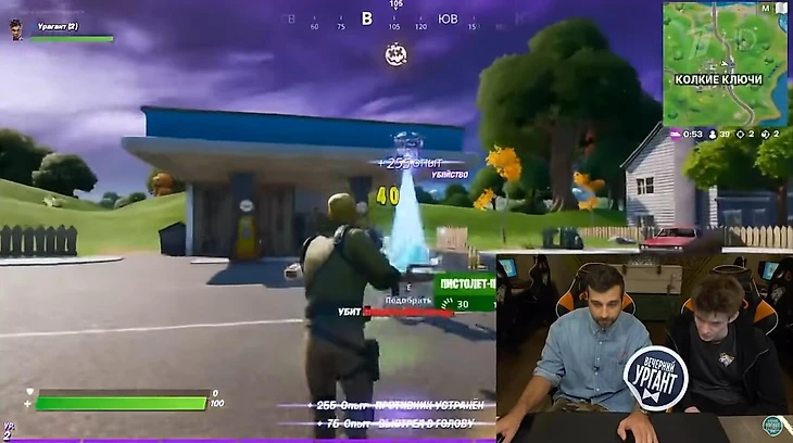 Ургант проверил свой скилл в «королевской битве» – основном режиме игры, где 100 персонажей десантируются на остров, а побеждает последний выживший. Ведущего учил игрок Virtus.pro Джамал «Jamside» Сайдаев, выигравший 100 тысяч долларов в парном турнире на чемпионате мира по Fortnite.