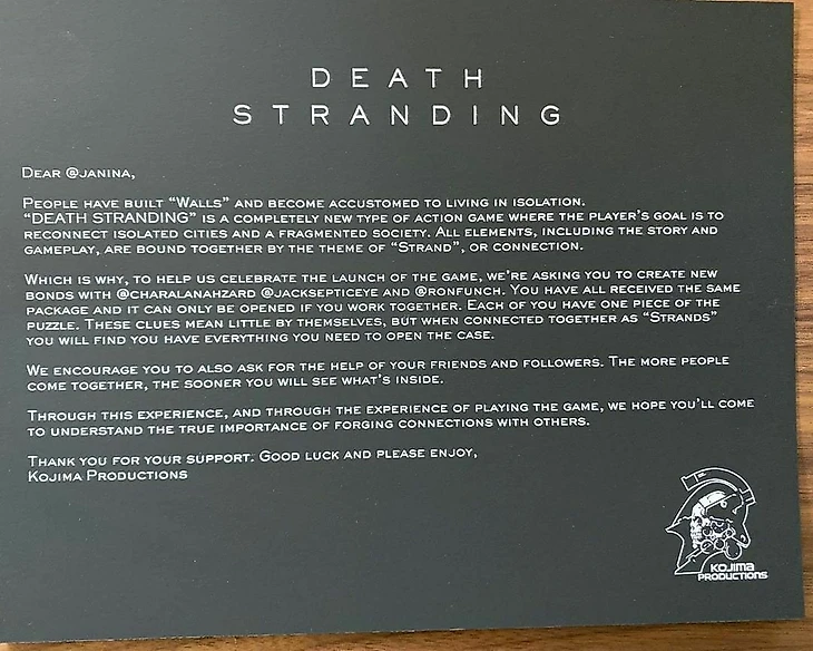 К посылке прилагалась карточка с обращением к адресату. В ней объясняется, что блогерам необходимо «создать новые узы» друг с другом, поскольку для открытия кейса (у всех он одинаковый) потребуются совместные усилия. Это задание отсылает к темам связи и объединения человечества, которым целиком посвящена Death Stranding.