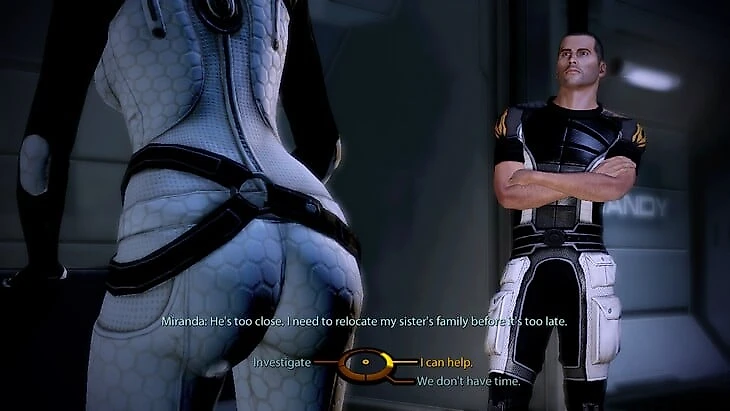 Знаменитый момент из Mass Effect 2, когда камера берет интересный ракурс между репликами. На самом деле излишняя сексуальность героини имеет особый, драматичный подтекст.