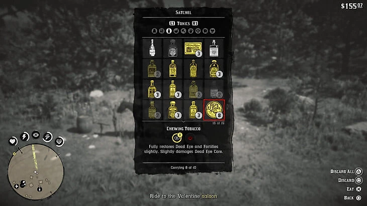 Кроме того, важно поить и кормить главного героя – что не только скажется на вашем единении с протагонистом, но и повлияет на его характеристики. В бою Артур использует всевозможные тоники (чем не зелья?) для поддержания шкал «Меткого глаза», здоровья и выносливости. Количество съеденного, выпитого и выкуренного влияет на то, как долго персонаж может бежать и, например, насколько хорошо целится. Еще Артуру необходимо периодически спать и отдыхать, чтобы оставаться в хорошей форме, и одеваться по погоде: в снежных районах утепляйтесь, чтобы не замерзнуть, а в более теплых краях подбирайте легкую, не стесняющую движения одежду.