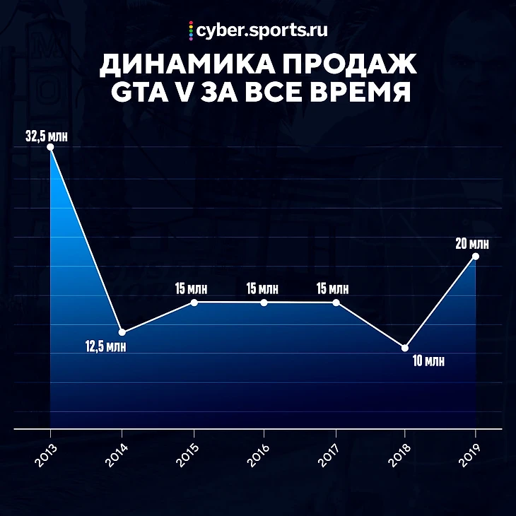 Только за 2019 год было отгружено 20 миллионов копий игры. Цифра не только огромна сама по себе, но и превышает показатели всех лет, кроме 2013-го, когда GTA 5 впервые поступила в продажу на PS3 и Xbox 360.