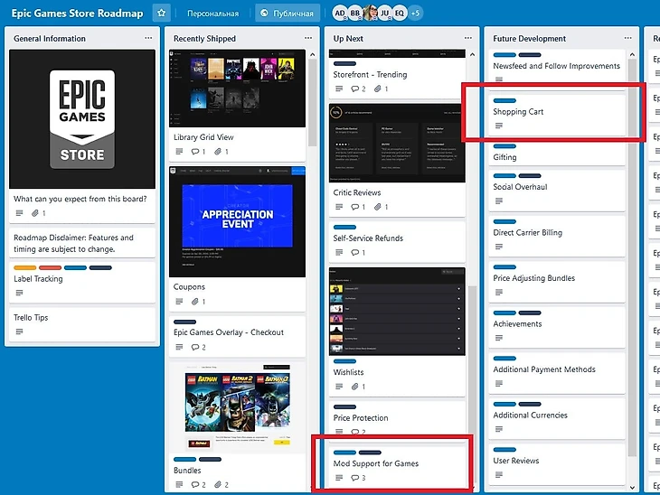 Функционал корзины появится в Epic Games Store нескоро. У сервиса есть публичная доска Trello, на которой Epic Games сортирует грядущие обновления магазина – «Корзина» пока находится в колонке «Планы на будущее». Зато поддержка модов, о которой часто просят игроки, уже числится среди «Следующих».