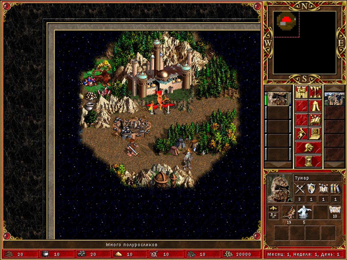 Тогда знания немного улеглись в голове и я хотя бы начал внимать происходящему, а не хаотично кликать по карте. Даже победил пару небольших отрядов врагов, захватил сундук сокровищ (который превратил в опыт для героя), лесопилку и источник руды. Понимал, что вряд ли играю правильно, но все равно тратил целые игровые дни на ожидание следующей недели у ворот своего города, чтобы пополнить армию и убить еще отряд-два.