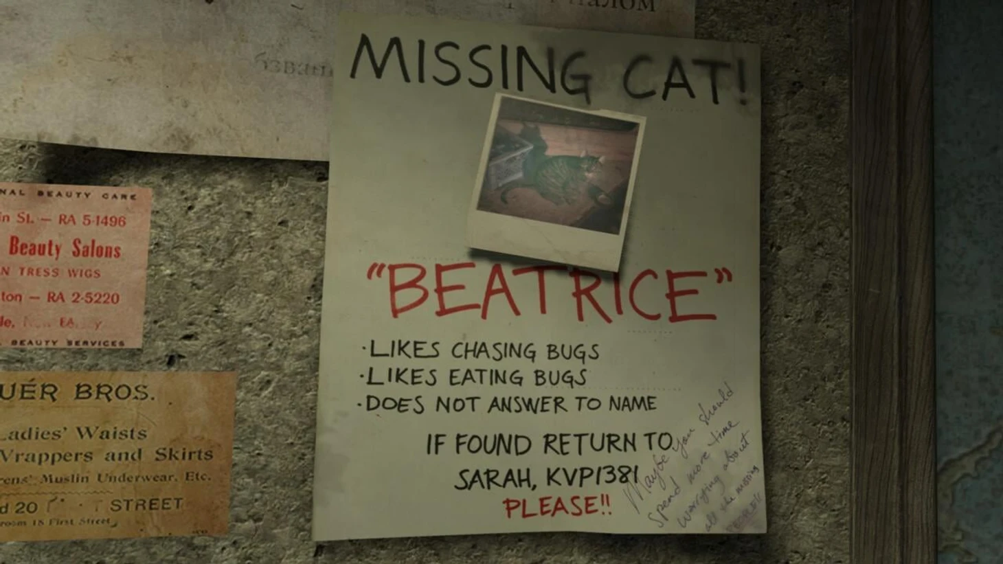 Проходя прачечную в ранней части игры, на доске объявлений можно заметить запись о пропавшей кошке по кличке Беатрис: она любит гоняться за жуками и не отзывается на свое имя.