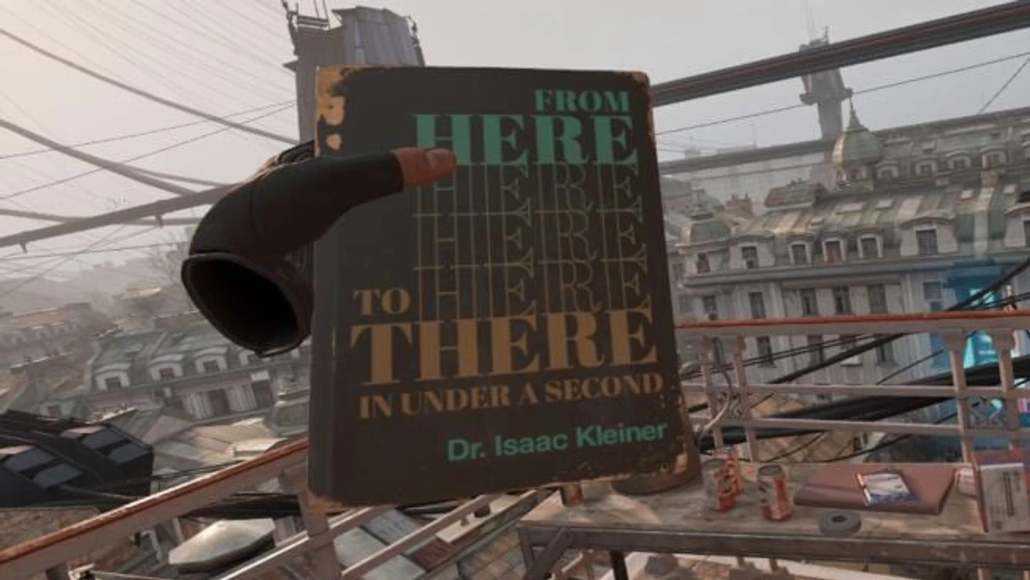 Обернувшись в самом начале игры, вы найдете книгу «Отсюда туда менее чем за секунду» Айзека Кляйнера, описывающую принцип работы телепортации. Правда, книгу нельзя прочитать, а можно лишь повертеть в руках. Кстати, такую же можно было найти в одной из глав Half-Life 2.