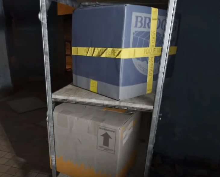 Среди вполне обычных коробок на локациях можно заметить темно-синий ящик, обмотанный желтой лентой. На одной из граней виден логотип Bridges – организации, на которую работает главный герой Death Stranding.