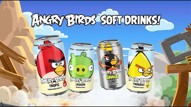 Еще в начале 10-х финская компания по производству напитков Olvi выпустила серию газировок с персонажами игры. Всего было 6 вкусов, по каждому на птицу: Tropic, Paradise, Lagoon, Comet, Sunrise, Amazon. Все, кроме последних двух, продавались и в России. Как и в случае с переживающей кризис Rovio, газировки «Птиц» дали огромный буст стагнирующему концерну.