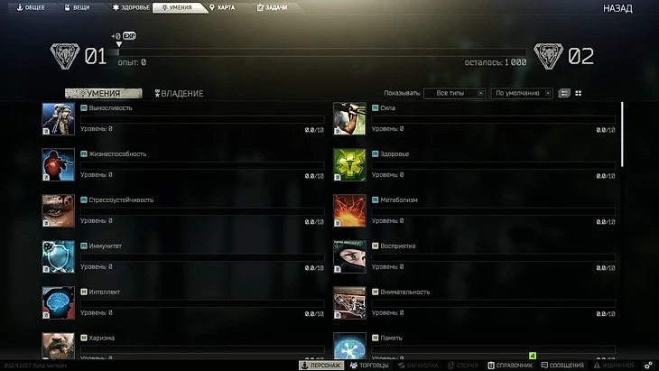 Следом находятся умения персонажа. С десяток разных перков, которые прокачиваются, видимо, во время боя, а еще есть общий уровень, который капает от каждого действия. Везде таймеры, везде шкалы, проценты и уровни.