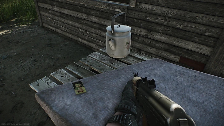 В общем, без каких-либо прыжков из парящих автобусов или самолетов я появился посреди лесной чащи и принялся исследовать окружение. Минут 5 бродил по безликому лесу, будто украденному из безымянного инди-хоррора, увидел УАЗик и приоткрытые ворота, оказавшиеся не выходом из рейда, а мертвой декорацией. Затем наткнулся на какую-то хижину (скорее просто большой короб), рядом с которым стоял стол с чайником (просто предмет окружения) и шоколадом «Аленкой»! Взял ее, скучающе побрел дальше – шла 15-я минута так называемого рейда.