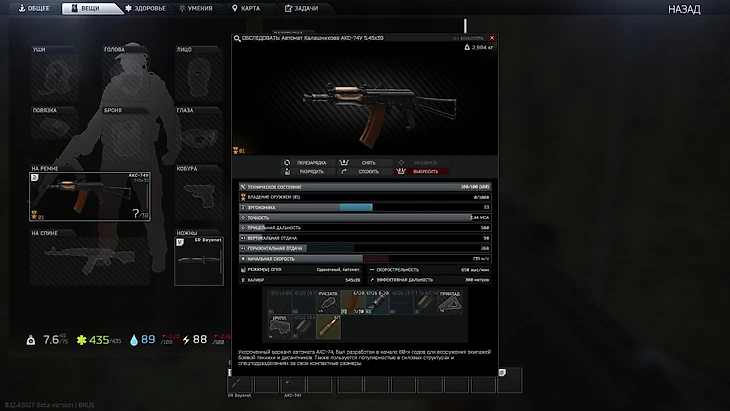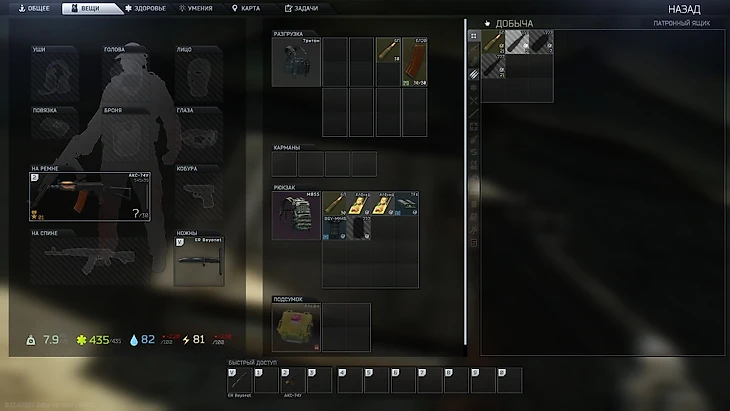 Не буду пересказывать все меню, доступные во время рейда – их слишком много. Вместо этого опишу инвентарь: тут у вас 10 специальных слотов снаряжения, предметы хранятся в рюкзаке, подсумке, карманах, разгрузке. У каждого оружия есть свои слоты модификаций, некоторые можно менять прямо в игре, другие нужно настраивать только вне рейдов. У персонажа четыре шкалы состояния: вес, здоровье, жажда, энергия – за каждым нужно следить. Лечиться в бою нужно по-правильному: где-то требуется шина, для других ран подойдут бинты.