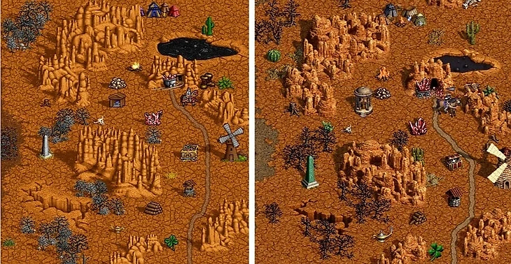 (Пустоши в «Героях 2» (слева) и их реинкарнация в HotA)