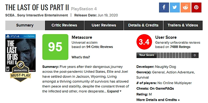 The Last of Us 2 ожидаемо вызвала яростные споры игроков, критиков, блогеров и вообще всех причастных к игровой индустрии. На момент написания материала средний балл игры на Metacritic составляет на 95 из 100, а вот пользовательская оценка держится на ужасающей отметке в 3,4 балла из 10. 7,5 тысяч пользователей поставили оценку (в большинстве случаев, категоричные «0» или «10») почти 30-часовой игре, вышедшей сутки назад в Новой Зеландии и еще позже в Европе и России. Это классический случай ревью-бомбинга – флэшмоба, когда пользователи массово топят среднюю оценку игры из-за недовольства каким-то связанным с ней событием или фактом.