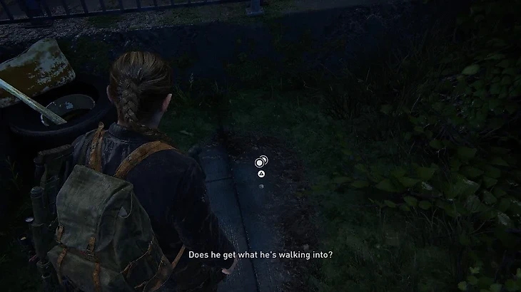 Перед тем как проползти под грузовиком, добираясь к главному поселению с Ярой и Левом, мы видим брошенную тележку слева. За ней на земле лежит монета.