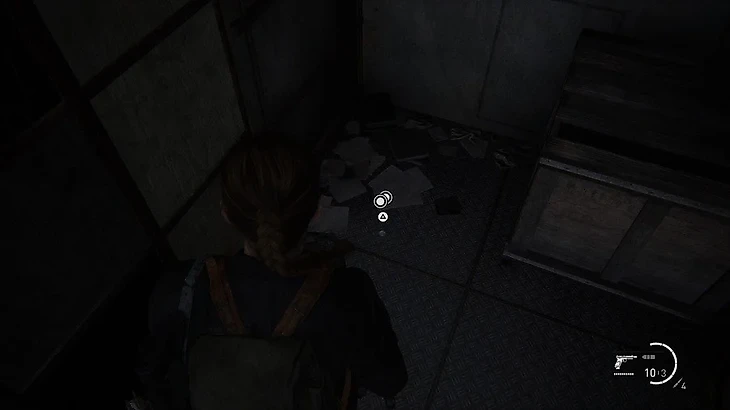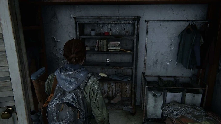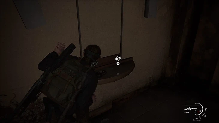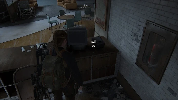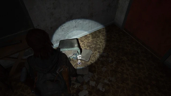 Спускаясь по отелю через металлические балки, после того как Эбби схватит приросший к стене зараженный, ищем комнату со шкафом и пустой рамкой. Там перепрыгиваем пропасть и берем монету со шкафа.