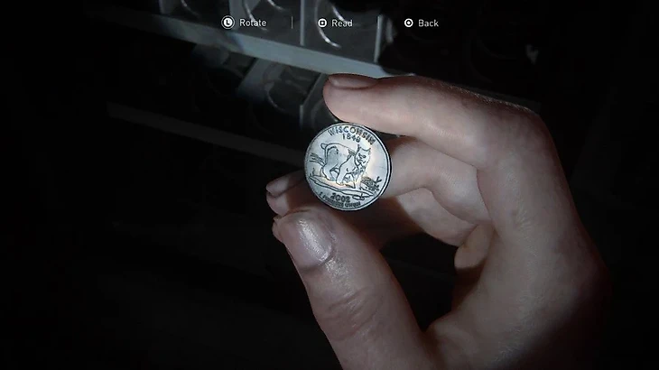 После поднятия по лестнице к верхней части шоссе, идем к открытому трейлеру слева. Внутри лежит монета.