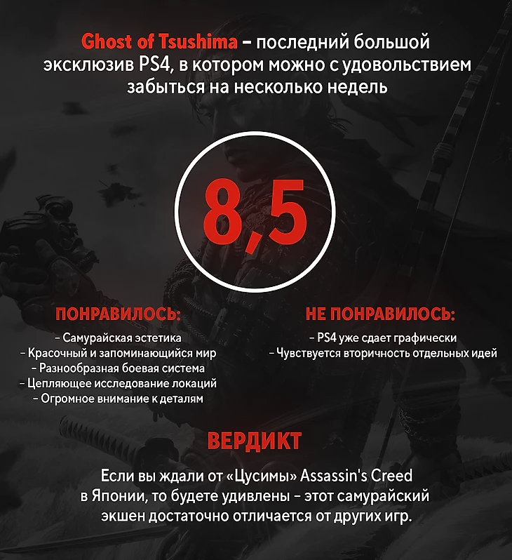 При всей душевности игра все-таки не идеальна. За время разработки она успела заметно состариться идейно: скалолазание выглядит зеркальным отражением Tomb Raider 2013 года, навигация по миру все-таки подсмотрена у последней «Зельды», а каких-то принципиально новых механик в «Цусиме» и нет. Да на фоне идеально выверенной линейной The Last of Us 2 видно, что железо оригинальной PS4 уже задыхается от открытого мира, изъяны графики местами сложно замаскировать даже ярким арт-дизайном.