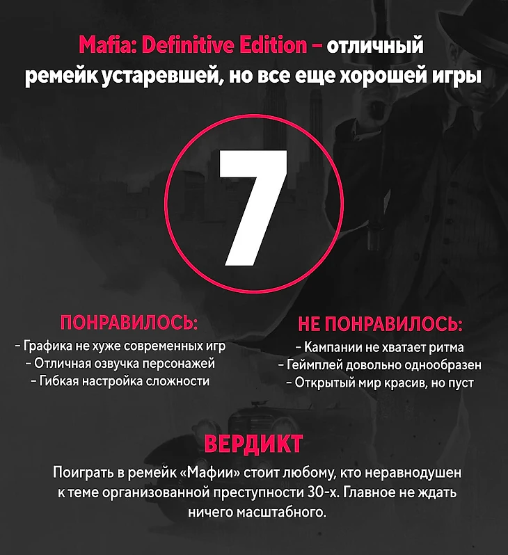 Mafia: Definitive Edition – один из тех объективно классных ремейков, которые хочется ругать за вещи, относящиеся к оригиналу, а такая критика в целом некорректна. Тем не менее я советую игру либо ностальгирующим фанатам, либо тем, кто настроен на марафон серии. Потому что впечатления от игры как от отдельной единицы могут оказаться не негативными, но какими-то неполноценными.