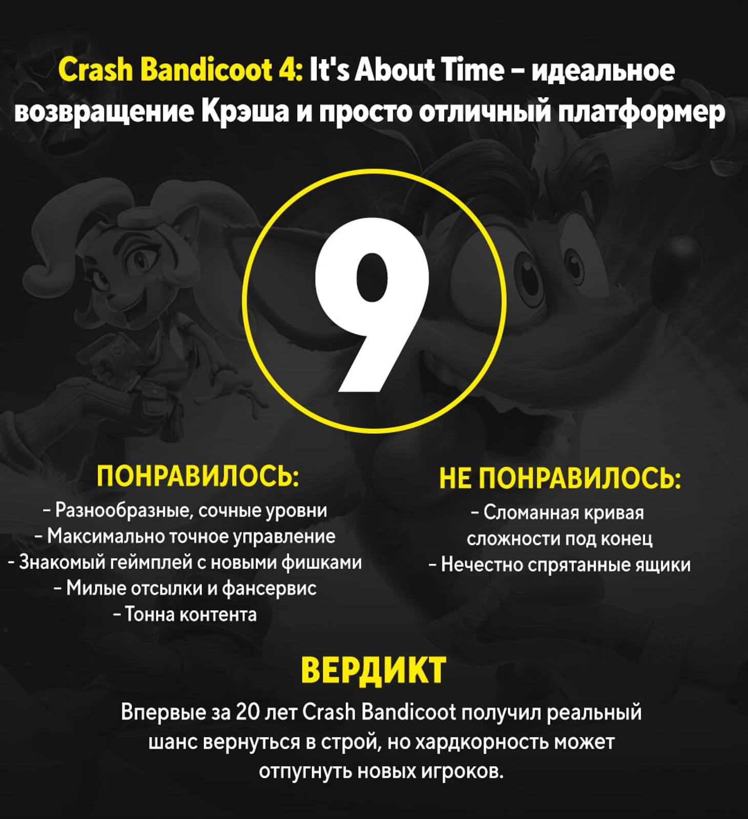 Crash Bandicoot 4 – практически идеальное возрождение серии: с узнаваемым геймплеем, парой десятков отсылок, всеми любимыми персонажами. Теперь вопрос лишь в том, смогут ли Toys For Bob (или другая студия Activision) двигаться дальше, а не опираться на формулу, придуманную Naughty Dog в 90-х. Но это разговоры о будущем, а в настоящем мы получили отличного нового «Крэша». Настоящий праздник.