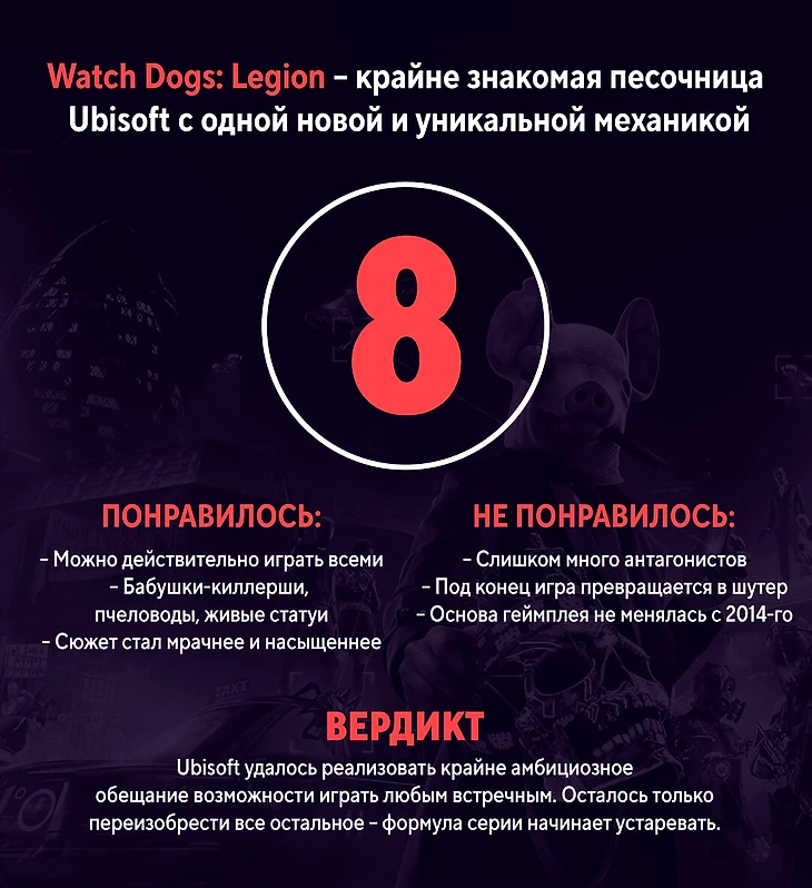 Авторы Watch Dogs: Legion не приукрасили – играть можно кем угодно и как угодно. Что важнее, это забавно, необычно и даже не надоедает. В остальном игра – чистой воды кросс-ген проект с чуть похорошевшей оберткой. Совсем не разочарование, но и не революция.