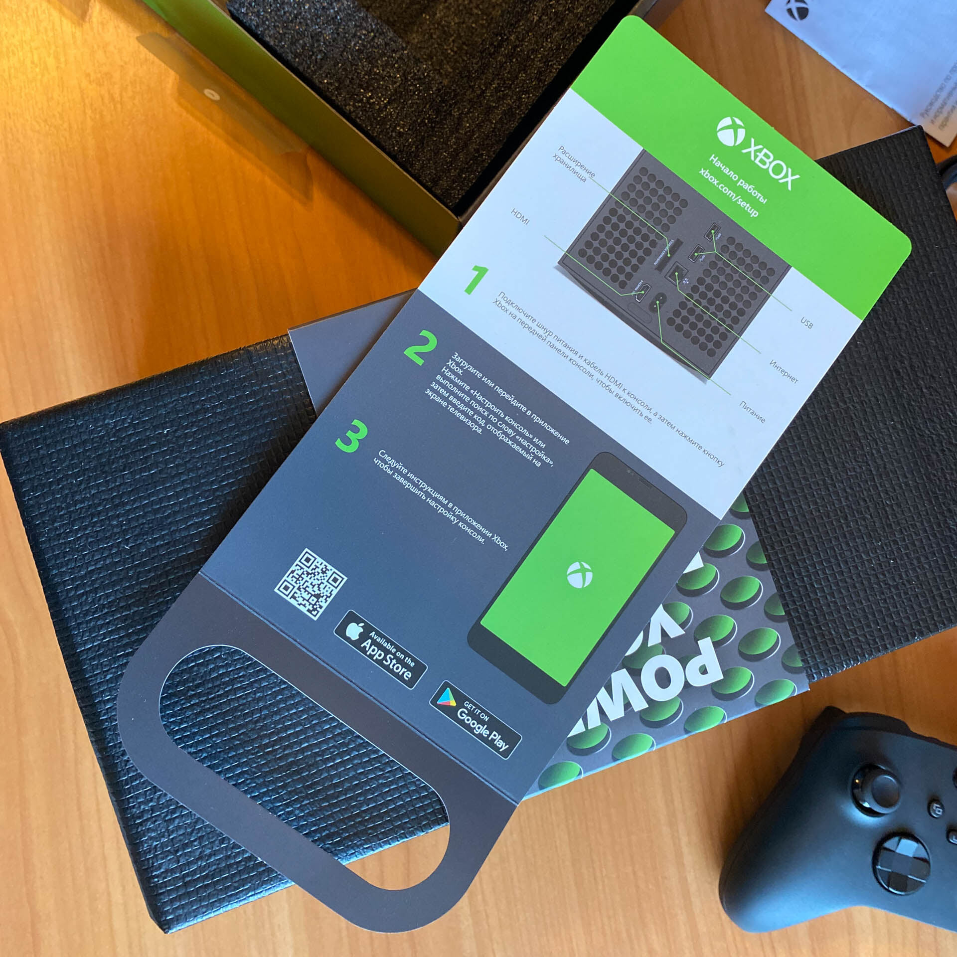 Под самой консолью лежал ярлычок, советующий скачать приложение Xbox, вставить батарейки в геймпад и, понятно, подключить консоль к сети:
