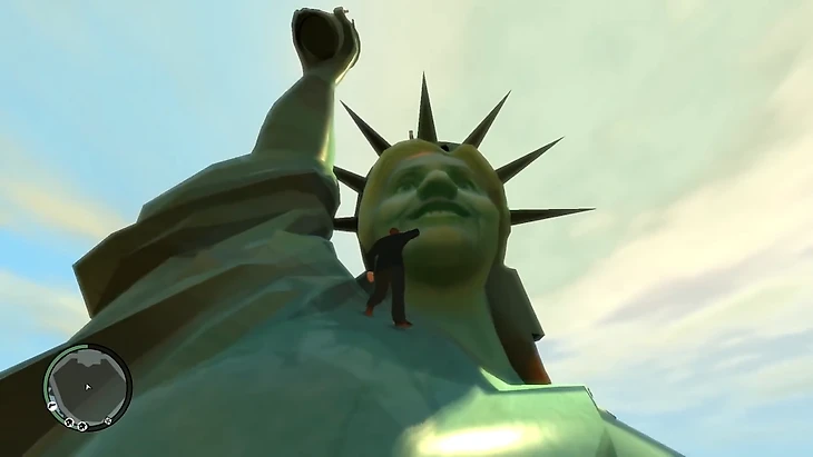 В Либерти-Сити, созданном на основе реального Нью-Йорка, знаменитую Статую Свободы заменили на похожий, но все-таки отличающийся памятник в том же месте. У Статуи Счастья в руках стаканчик кофе вместо факела, а ее лицо сильно напоминает политика Хиллари Клинтон.