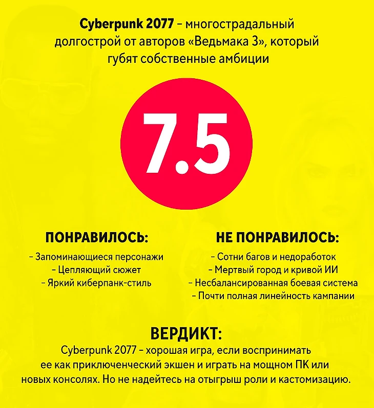 И все-таки у поляков получилась хорошая сюжетная игра. Скорее «на один раз», но не в оскорбительном смысле, а в том, что история Ви всегда будет примерно одинаковой. Теперь главное, чтобы к руководству CD Projekt RED вернулось чувство реальности, и Cyberpunk 2078 или «Ведьмак 4» вышел таким, как его задумывали авторы. Без ложных обещаний, постоянных вылетов и нерабочих версий для старых консолей.