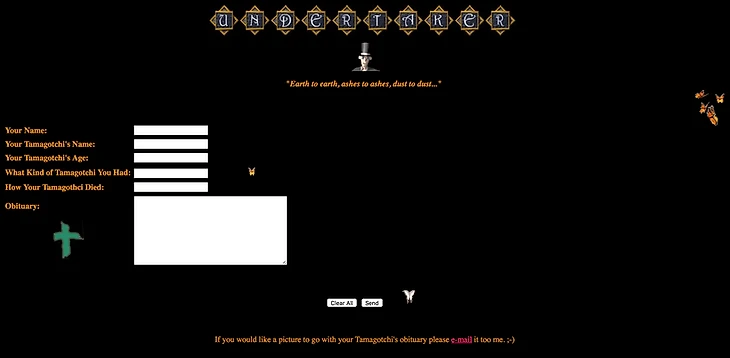 Другим, более простым способом проститься с любимым тамагочи были ритуальные онлайн-агентства. По сути, просто фанатские сайты, позволяющие добавить памятную запись в базу данных, заполнив поля вроде «кличка», «возраст», «причина смерти», «имя владельца» и «прощальное послание». Многие анкеты получались серьезными и искренними, но были и ироничные случаи: например, причиной смерти тамагочи мог стать «случайный сброс». Такое происходило, например, когда игрушку клали в задний карман джинсов и случайно на нее садились.