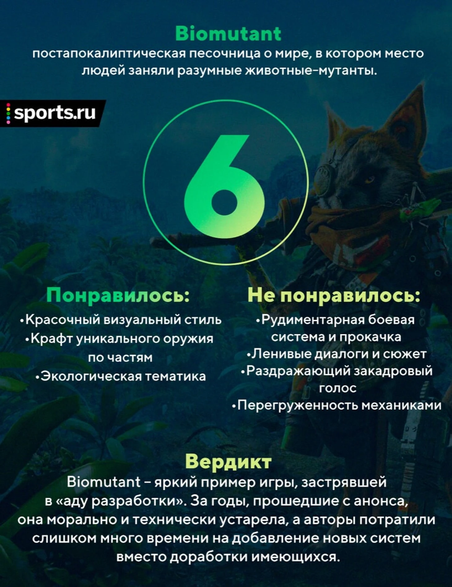 Обиднее всего, что Biomutant своим появлением загрязнила крошечную нишу больших семейных эко-игр. Кажется, как минимум в ближайшее десятилетие территория будет необитаемой, потому что у руководителей игровых издательств будет пример неудачного проекта с такой идеей.
