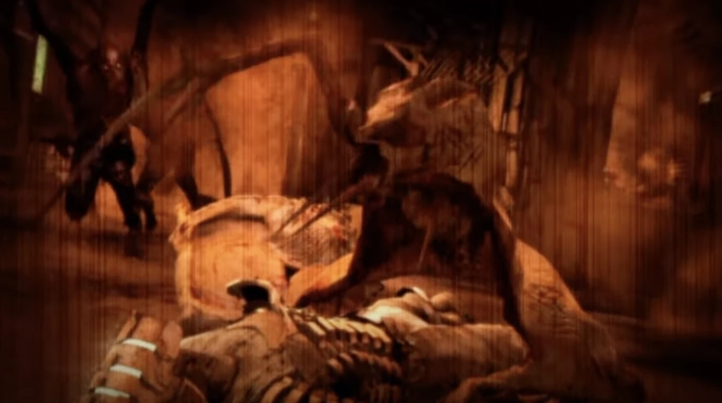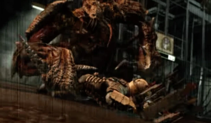 Затем монтаж трейлера ускоряется, окончательно превращаясь в хоррор. На пике напряжения зрителю показывают не простого некроморфа (уже достаточно жутких монстров), а одну из более крупных тварей, расправляющихся с протагонистом игры Айзеком Кларком.