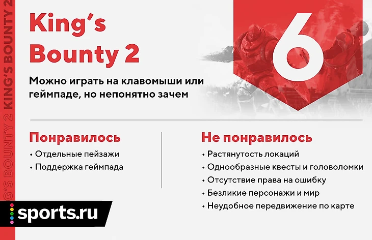 Финальная оценка могла быть еще ниже, если бы не две важные оговорки. Во-первых, хоть я и ругал King’s Bounty 2 весь текст, я лишь хотел подчеркнуть, насколько игра не дотянула до раскрытия своего потенциала – части геймеров она все равно понравится и в этом не будет ничего удивительного. Это далеко не худший способ провести 30-40 часов, если вы любите что-то околостратегическое и околофэнтезийное – другой вопрос, что и далеко не лучший вариант тоже. Во-вторых, я верю, что многие проблемы игры – от скорости передвижения персонажа до сломанной и нечестной экономики – разработчики вполне смогут исправить патчами, а более серьезные недостатки устранить или сгладить в дополнениях. Судя по всему, они уже планируются – если игра не окажется полным провалом, конечно. И желать ей такой судьбы мне совершенно не хочется.